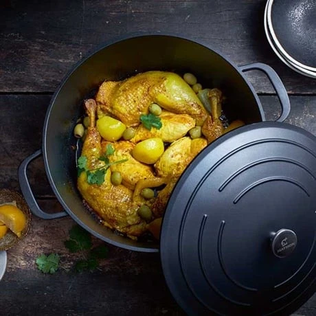 Ce matériau de qualité conduit bien la chaleur et la répartit uniformément dans la cuve tout au long de la cuisson. Avec son couvercle à picots, la condensation créée se transforme en gouttelettes et ruisselle en continu pour un résultat tendre et hydraté.