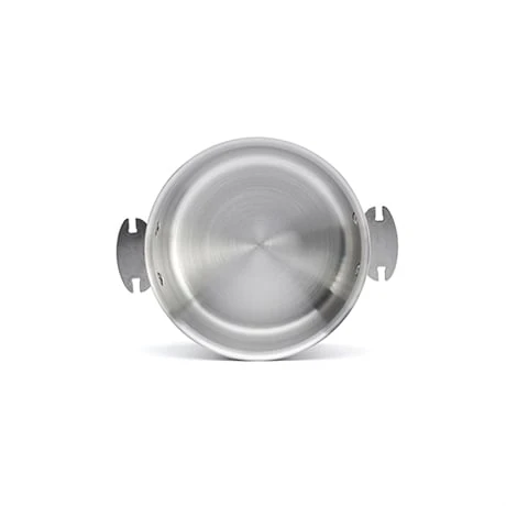 La casserole en inox finition brossée dispose de 2 embases solidement rivetées. Elle s’utilise avec le manche en fonte d’inox Loqy ou associée à la paire d’anses en bois de hêtre pour se transformer en faitout.
